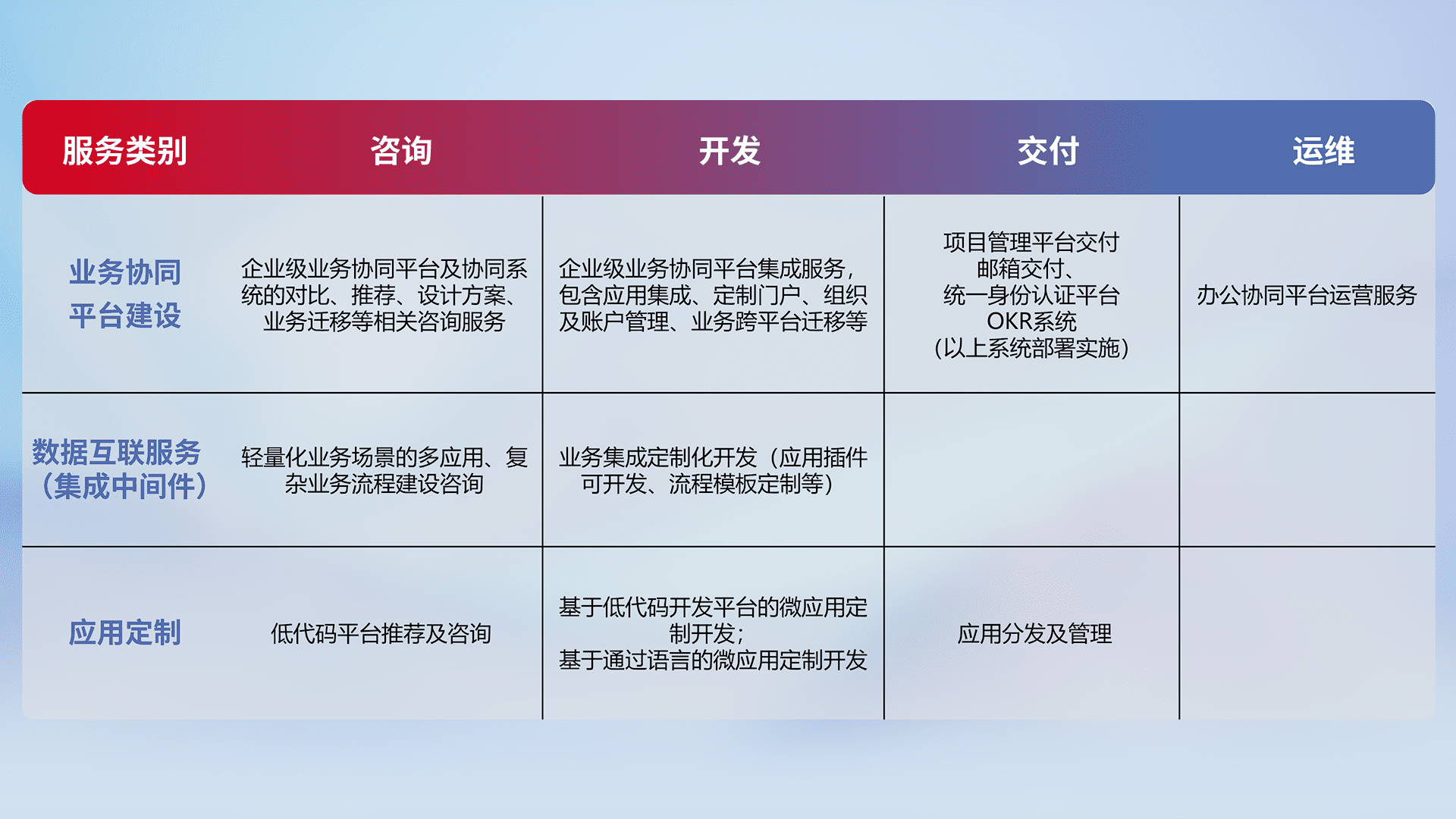 针对钉钉、、、、企微、、IDaas等平台级产品提供产品的规划、、、、方案、、、、交付、、、定制化开发等服务,,实现如统一协同办公、、、智能客户服务、、混合会议管理、、、、智能数据查询、、、、等业务场景,,,实现数字化转型。。