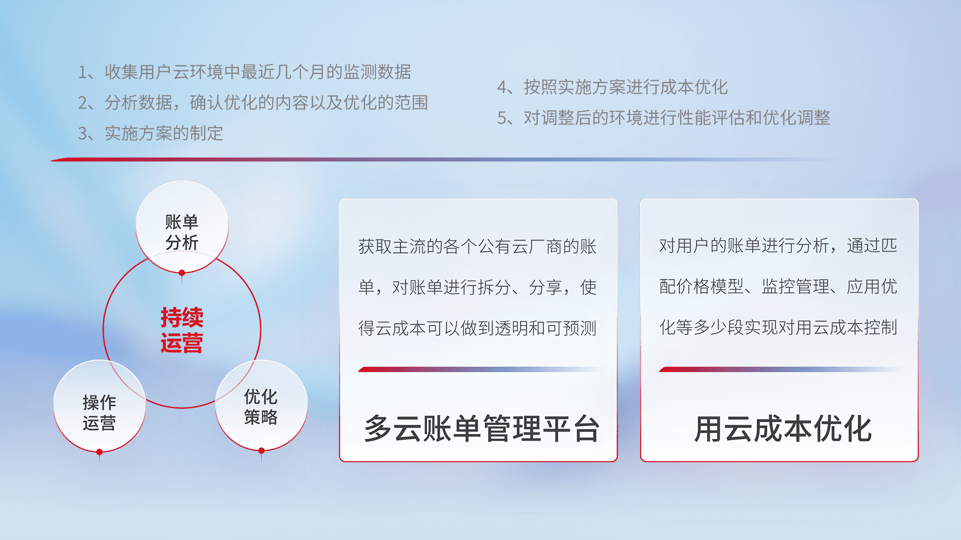 通过多云纳管,,,,以统一的资源数据模型把客户的云资源进行抽象和封装,,进而实现对多云资源的统一操作,,,,保障云资源管理的可靠性、、稳定性与可用性。。量身定制化运维内容,,配置、、、开发运维、、、补丁管理、、、备份、、、、监控、、认证和访问管理、、、、审计和日常巡检等,,,保障在用云过程中的可靠度,,稳定度以及高可用率。。