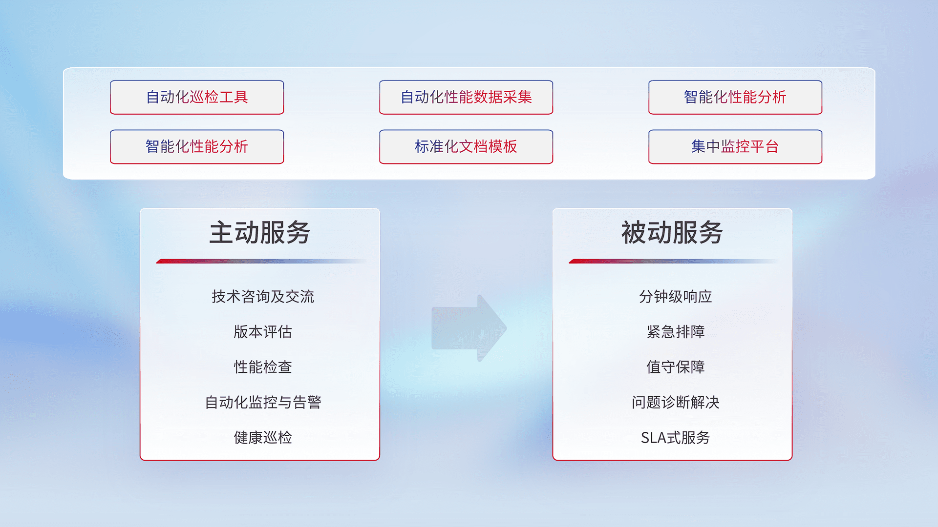 智能化工具和标准化文档,,,,保障服务质量,,,,提供主动服务(包含技术咨询、、版本评估、、、、性能检查、、、、自动化监控与告警、、、健康巡检)和被动服务包含(分钟级响应、、、、紧急排障、、、值守保障、、问题诊断解决、、SLA服务)。。